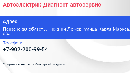 Автоэлектрик-Диагност, автосервис по адресу Пензенская область, Нижний Ломов, улица Карла Маркса, 65а в дальнейшем Организация, размещена в следующих категориях: