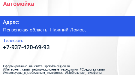 Автомойка по адресу Пензенская область, Нижний Ломов, в дальнейшем Организация, размещена в следующих категориях: