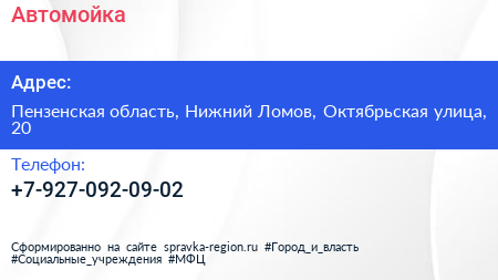 Автомойка по адресу Пензенская область, Нижний Ломов, Октябрьская улица, 20 в дальнейшем Организация, размещена в следующих категориях: