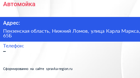 Автомойка по адресу Пензенская область, Нижний Ломов, улица Карла Маркса, 65Б в дальнейшем Организация, размещена в следующих категориях: