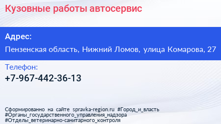 Кузовные работы, автосервис по адресу Пензенская область, Нижний Ломов, улица Комарова, 27 в дальнейшем Организация, размещена в следующих категориях: