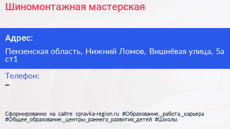 Шиномонтажная мастерская по адресу Пензенская область, Нижний Ломов, Вишнёвая улица, 5а ст1 в дальнейшем Организация, размещена в следующих категориях: