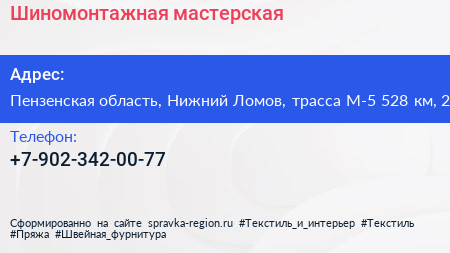 Шиномонтажная мастерская по адресу Пензенская область, Нижний Ломов, трасса М-5 528 км, 2 в дальнейшем Организация, размещена в следующих категориях: