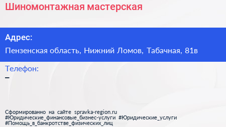 Шиномонтажная мастерская по адресу Пензенская область, Нижний Ломов, Табачная, 81в в дальнейшем Организация, размещена в следующих категориях: