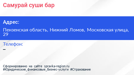 Самурай, суши-бар по адресу Пензенская область, Нижний Ломов, Московская улица, 29 в дальнейшем Организация, размещена в следующих категориях: