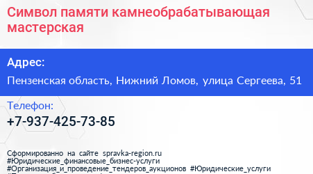Символ памяти, камнеобрабатывающая мастерская по адресу Пензенская область, Нижний Ломов, улица Сергеева, 51 в дальнейшем Организация, размещена в следующих категориях: