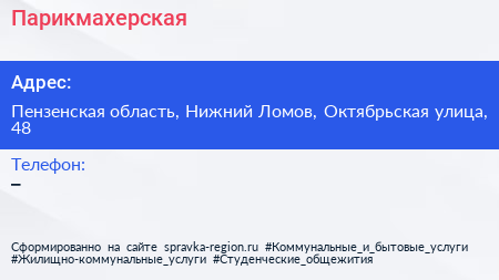 Парикмахерская по адресу Пензенская область, Нижний Ломов, Октябрьская улица, 48 в дальнейшем Организация, размещена в следующих категориях: