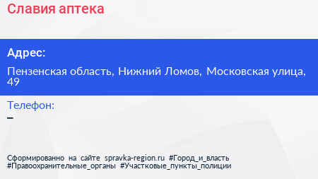 Славия, аптека по адресу Пензенская область, Нижний Ломов, Московская улица, 49 в дальнейшем Организация, размещена в следующих категориях: