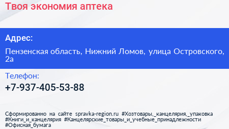 Твоя экономия, аптека по адресу Пензенская область, Нижний Ломов, улица Островского, 2а в дальнейшем Организация, размещена в следующих категориях: