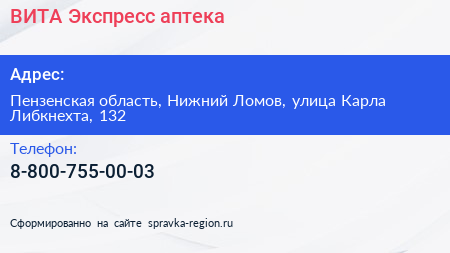 ВИТА Экспресс, аптека по адресу Пензенская область, Нижний Ломов, улица Карла Либкнехта, 132 в дальнейшем Организация, размещена в следующих категориях: