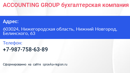 ACCOUNTING GROUP, бухгалтерская компания по адресу 603024, Нижегородская область, Нижний Новгород, Белинского, 63 в дальнейшем Организация, размещена в следующих категориях: