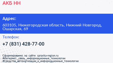 АКБ-НН по адресу 603105, Нижегородская область, Нижний Новгород, Ошарская, 69 в дальнейшем Организация, размещена в следующих категориях: