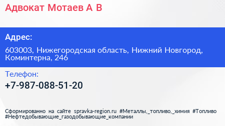 Адвокат Мотаев А.В. по адресу 603003, Нижегородская область, Нижний Новгород, Коминтерна, 246 в дальнейшем Организация, размещена в следующих категориях: