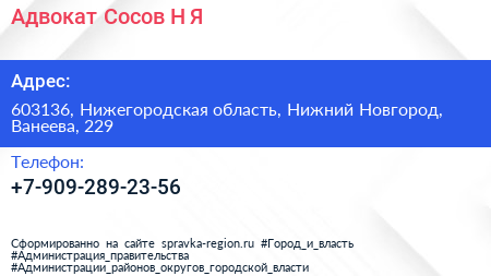 Адвокат Сосов Н.Я. по адресу 603136, Нижегородская область, Нижний Новгород, Ванеева, 229 в дальнейшем Организация, размещена в следующих категориях: