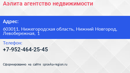 Аэлита, агентство недвижимости по адресу 603011, Нижегородская область, Нижний Новгород, Левобережная, 1 в дальнейшем Организация, размещена в следующих категориях: