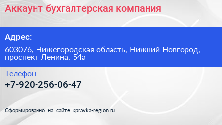 Аккаунт, бухгалтерская компания по адресу 603076, Нижегородская область, Нижний Новгород, проспект Ленина, 54а в дальнейшем Организация, размещена в следующих категориях: