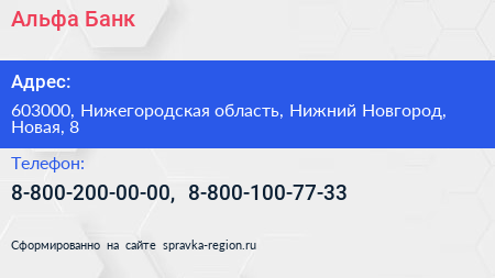 Альфа-Банк по адресу 603000, Нижегородская область, Нижний Новгород, Новая, 8 в дальнейшем Организация, размещена в следующих категориях: