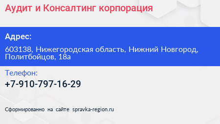 Аудит и Консалтинг, корпорация по адресу 603138, Нижегородская область, Нижний Новгород, Политбойцов, 18а в дальнейшем Организация, размещена в следующих категориях: