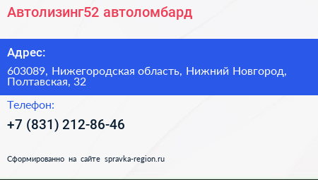 Автолизинг52, автоломбард по адресу 603089, Нижегородская область, Нижний Новгород, Полтавская, 32 в дальнейшем Организация, размещена в следующих категориях: