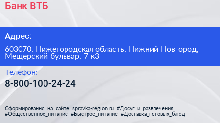 Банк ВТБ по адресу 603070, Нижегородская область, Нижний Новгород, Мещерский бульвар, 7 к3 в дальнейшем Организация, размещена в следующих категориях: