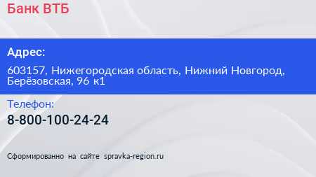 Банк ВТБ по адресу 603157, Нижегородская область, Нижний Новгород, Берёзовская, 96 к1 в дальнейшем Организация, размещена в следующих категориях: