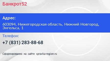 Банкрот52 по адресу 603094, Нижегородская область, Нижний Новгород, Энгельса, 1 в дальнейшем Организация, размещена в следующих категориях: