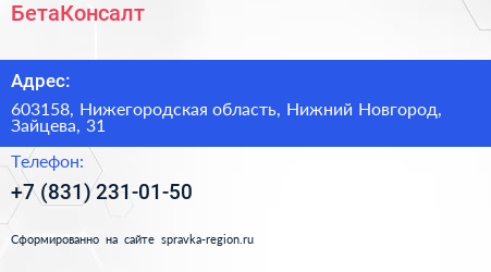 БетаКонсалт по адресу 603158, Нижегородская область, Нижний Новгород, Зайцева, 31 в дальнейшем Организация, размещена в следующих категориях: