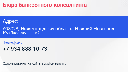 Бюро банкротного консалтинга по адресу 603028, Нижегородская область, Нижний Новгород, Кузбасская, 1г к2 в дальнейшем Организация, размещена в следующих категориях:
