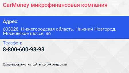 CarMoney, микрофинансовая компания по адресу 603028, Нижегородская область, Нижний Новгород, Московское шоссе, 86 в дальнейшем Организация, размещена в следующих категориях: