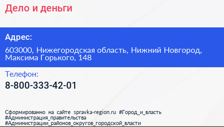 Дело и деньги по адресу 603000, Нижегородская область, Нижний Новгород, Максима Горького, 148 в дальнейшем Организация, размещена в следующих категориях: