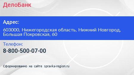 ДелоБанк по адресу 603000, Нижегородская область, Нижний Новгород, Большая Покровская, 60 в дальнейшем Организация, размещена в следующих категориях: