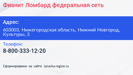 Фианит-Ломбард, федеральная сеть по адресу 603003, Нижегородская область, Нижний Новгород, Культуры, 3 в дальнейшем Организация, размещена в следующих категориях: