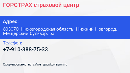 ГОРСТРАХ, страховой центр по адресу 603070, Нижегородская область, Нижний Новгород, Мещерский бульвар, 5а в дальнейшем Организация, размещена в следующих категориях:
