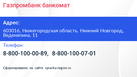 Газпромбанк, банкомат по адресу 603016, Нижегородская область, Нижний Новгород, Веденяпина, 11 в дальнейшем Организация, размещена в следующих категориях: