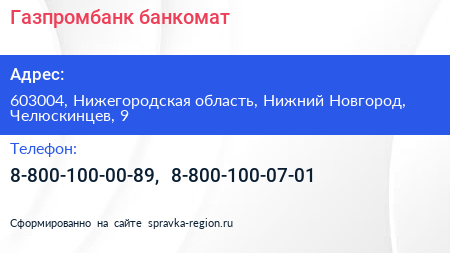 Газпромбанк, банкомат по адресу 603004, Нижегородская область, Нижний Новгород, Челюскинцев, 9 в дальнейшем Организация, размещена в следующих категориях: