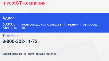 InvestGT, компания по адресу 603005, Нижегородская область, Нижний Новгород, Минина, 10в в дальнейшем Организация, размещена в следующих категориях: