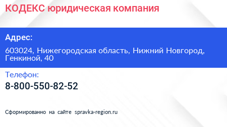 КОДЕКС, юридическая компания по адресу 603024, Нижегородская область, Нижний Новгород, Генкиной, 40 в дальнейшем Организация, размещена в следующих категориях: