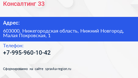 Консалтинг 33 по адресу 603000, Нижегородская область, Нижний Новгород, Малая Покровская, 1 в дальнейшем Организация, размещена в следующих категориях: