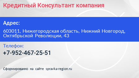 Кредитный Консультант, компания по адресу 603011, Нижегородская область, Нижний Новгород, Октябрьской Революции, 43 в дальнейшем Организация, размещена в следующих категориях:
