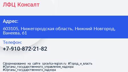 ЛФЦ Консалт по адресу 603105, Нижегородская область, Нижний Новгород, Ванеева, 61 в дальнейшем Организация, размещена в следующих категориях: