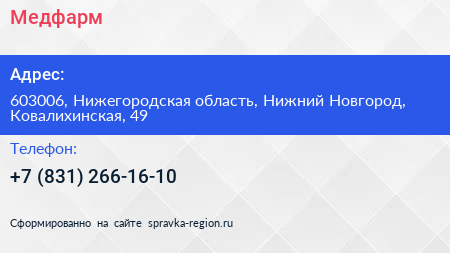 Медфарм по адресу 603006, Нижегородская область, Нижний Новгород, Ковалихинская, 49 в дальнейшем Организация, размещена в следующих категориях:
