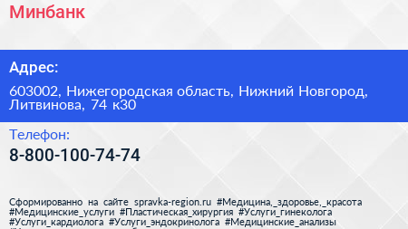 Минбанк по адресу 603002, Нижегородская область, Нижний Новгород, Литвинова, 74 к30 в дальнейшем Организация, размещена в следующих категориях: