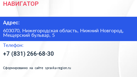 Для связи с организацией воспользуйтесь номером телефона: +7 (831) 266-68-30. Пн: c 08:00-17:00, Вт: c 08:00-17:00, Ср: c 08:00-17:00, Чт: c 08:00-17:00, Пт: c 08:00-17:00, Сб: выходной, Вс: выходной, вы можете обратиться в эту организацию.