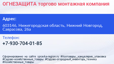 ОГНЕЗАЩИТА, торгово-монтажная компания по адресу 603146, Нижегородская область, Нижний Новгород, Саврасова, 26а в дальнейшем Организация, размещена в следующих категориях: