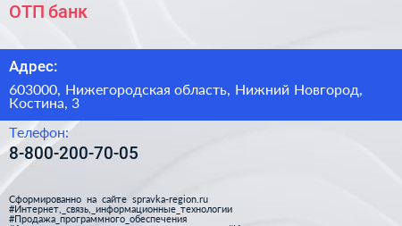 ОТП банк по адресу 603000, Нижегородская область, Нижний Новгород, Костина, 3 в дальнейшем Организация, размещена в следующих категориях: