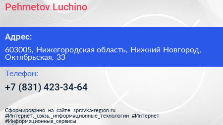 Pehmetov & Luchino по адресу 603005, Нижегородская область, Нижний Новгород, Октябрьская, 33 в дальнейшем Организация, размещена в следующих категориях: