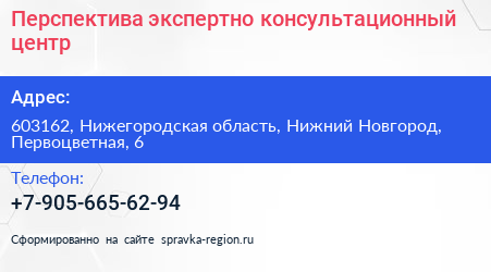 Перспектива, экспертно-консультационный центр по адресу 603162, Нижегородская область, Нижний Новгород, Первоцветная, 6 в дальнейшем Организация, размещена в следующих категориях: