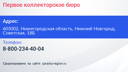 Первое коллекторское бюро по адресу 603002, Нижегородская область, Нижний Новгород, Советская, 18Б в дальнейшем Организация, размещена в следующих категориях: