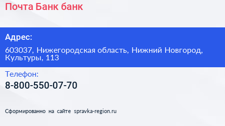 Почта Банк, банк по адресу 603037, Нижегородская область, Нижний Новгород, Культуры, 113 в дальнейшем Организация, размещена в следующих категориях: