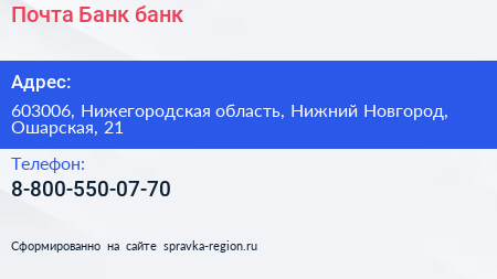 Почта Банк, банк по адресу 603006, Нижегородская область, Нижний Новгород, Ошарская, 21 в дальнейшем Организация, размещена в следующих категориях: